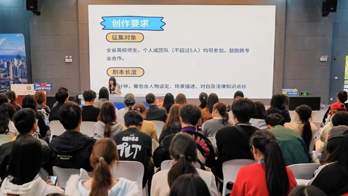 集中宣讲环节,昆明信息港工作人员聚焦学生未来就业方向,详细介绍了“我为普法写个剧”情景剧剧本创作活动的背景、参与方式与评选机制,从传媒行业的现实需求出发,点明了此次创作实践对学生未来就业的独特价值,鼓励同学们用剧本创作传递法治精神,让普法“活”起来。
