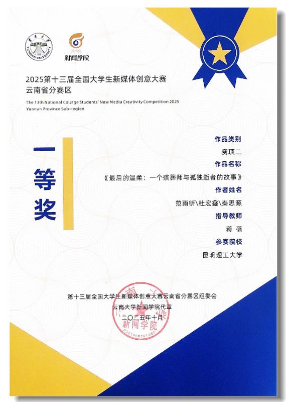 其中,范雨昕、杜宏鑫、秦思源三位同学联合创作的《最后的温柔:一个殡葬师与孤独逝者的故事》,以其深刻的人文视角和真挚的言说力量,荣获第十三届全国大学生新媒体创意大赛云南赛区一等奖。