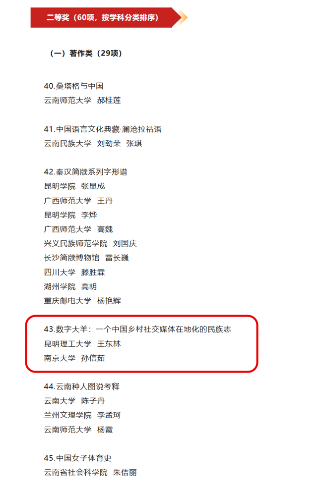 近日,云南省社会科学优秀成果奖评选结果正式公布,自拍流出 王东林副教授凭借学术专著《数字大羊:一个中国乡村社交媒体在地化的民族志》,荣获云南省社会科学奖二等奖,为学院与学校再添殊荣。